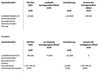 Der Finanzausschuss beschließt eine überplanmäßige Ausgabe in Höhe von 141.000 EUR in der Haushaltsstelle 2.630000.950000.123 - Gemeindestraßen - Baumaßnahmen - Ohrdrufer Straße - Planung.