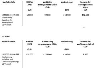 Der Finanzausschuss beschließt eine überplanmäßige Ausgabe in Höhe von 10.500 EUR in der Haushaltsstelle 1.610000.655100.999 - Stadtplanung - Ausgaben für Bauleitpläne / UE-Vermerk.