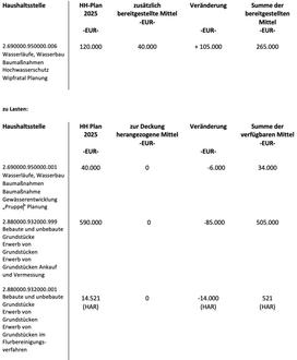Der Finanzausschuss beschließt eine überplanmäßige Ausgabe in Höhe von 105.000 EUR in der Haushaltstelle 2.690000.950000.006 - Wasserläufe, Wasserbau - Baumaßnahmen - Hochwasserschutz Wipfratal Planung.