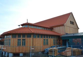 Wenn alles wie geplant läuft, wird die Ostwand eine „Ost(er)wand“. In den letzten Wochen waren der finale Reisigbündel-Einbau sowie das Anbringen der Wandverkleidungen hier die prägenden Arbeiten. Der Windfang, der technische Aufgang, die Brüstungen und beide Giebel erhielten ihre Verschalungen. Beidseitig des Reisig-Stapels stehen die Spritzschutz-Barrieren und das Reisig erhielt den ersten Schnitt. Ebenso wurde der Anschluss zum „Museum am Gradierwerk“ rekonstruiert. Jüngst wurden zudem Drahtfenster in den beiden Ostwand-Giebeln und der östlichen Brunnenhalle eingesetzt und mit passenden Fensterbänken versehen. Die Pumpen für den Sole-Kreislauf sind eingebaut und werden demnächst an das Stromnetz angeschlossen. An der Elektrik für Beleuchtungen, Notbeleuchtungen und der Beschallungstechnik wird noch gearbeitet.
