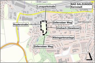 Das Plangebiet liegt in der Kernstadt Bad Salzungen. Der Geltungsbereich wird im Norden von der „Lunaparkstraße“, im Osten sowie Süden vom „Zellerodaer Weg“ und im Westen von der „Keplerstraße“ begrenzt. Im Osten und Süden verläuft parallel zum „Zellerodaer Weg“ der „Unzbach“ (Gewässer).