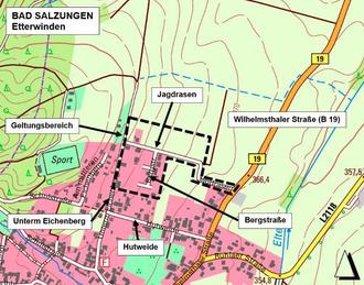 Das Plangebiet liegt im Ortsteil Etterwinden. Der Geltungsbereich wird im Westen von der Straße „Unterm Eichenberg“ begrenzt. Südlich schließt sich die bebaute Ortslage mit der Straße „Hutweide“ an. Im Osten wird das Plangebiet überwiegend von einer Grünfläche begrenzt. Lediglich im Bereich der Straße „Jagdrasen“ verläuft dieser bis an die „Wilhelmsthaler Straße“ heran. Im Norden schließt sich eine Grünfläche an das Plangebiet an. Im Geltungsbereich befinden sich die Straßen „Jagdrasen“ und „Bergstraße“.