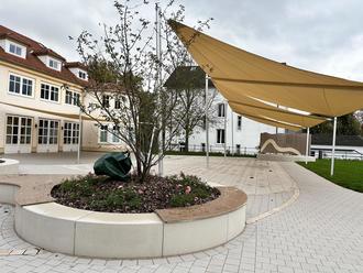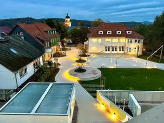 Es ist die ideale Verschmelzung von einem Ort für Leseratten und Musikbegeisterte - das zeigt schon das ansehnliche Relief in den Zugangstoren. Der neugeschaffene Kulturgarten auf der Freifläche zwischen der Stadt- und Kreisbibliothek und der Musikschule Wartburgkreis ist fertig gestellt. „Fristgerecht und im Sprint“, wie Bürgermeister Klaus Bohl bei der feierlichen Übergabe dieser Baumaßnahme betonte. Innerhalb von nur einem dreiviertel Jahr wurde hier im Rekordtempo eine Außenanlage geschaffen, die sich sehen lassen kann. Der Entwurf zur Gestaltung des Kulturgartens wurde mit dem Landratsamt und der Stadtverwaltung, jeweils zuständig für Musikschule und Bibliothek entwickelt, abgestimmt und in den städtischen Gremien vorgestellt. Dank der guten Zusammenarbeit im Stadtrat konnte auch hier schnell grünes Licht gegeben werden. Dieser neugestaltete Freiraum soll verschiedene Funktionen erfüllen: In den Sommermonaten sollen hier diverse Veranstaltungen stattfinden. Dafür ist der Kulturgarten mit attraktiver Begrünung, zahlreichen Sitzmöglichkeiten und gepflegten Rasenflächen gestaltet. Bei Bedarf kann ein Teil der Fläche auch mit Sonnenschutz verschattet werden. Mal Festbeleuchtung, mal heimeliges indirektes Licht: Dank eines durchdachten Beleuchtungskonzeptes können die energiesparenden LED je nach Veranstaltung passend eingesetzt werden.
