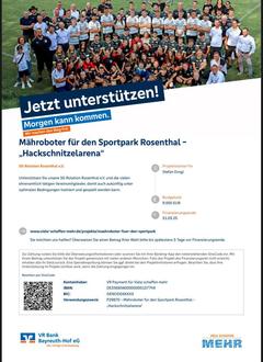 Wir möchten gerne einen Mähroboter für den Sportpark Rosenthal - „Hackschnitzelarena“ anschaffen, der unsere ehrenamtlichen Helfer bei der Sportplatzpflege unterstützt. Dafür haben wir uns für das Crowdfunding bei der VR Bank Bayreuth-Hof qualifiziert. Jeder Euro, der in der Finanzierungsphase gespendet wird, wird mit 25% von der VR Bank Bayreuth-Hof aufgestockt.
