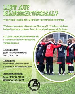 | • | Wir suchen Mädchen im Alter von 12 bis 17 Jahren, die Lust auf Fußball haben |