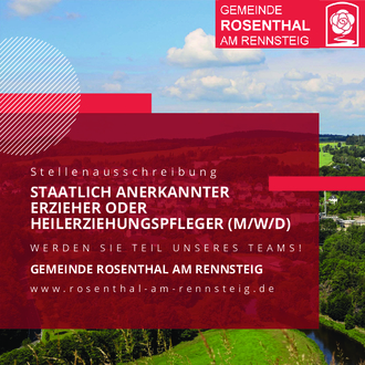 Die Gemeinde Rosenthal am Rennsteig sucht für eine unbefristete Einstellung für ihre Kindertagesstätten in Blankenberg, Blankenstein, Harra und Neundorf einen staatlich anerkannten Erzieher oder staatlich anerkannten Heilerziehungspfleger (m, w, div.) ab sofort in Teilzeitbeschäftigung mit 32 Wochenstunden mit der Option der Erhöhung des Stellenumfangs.