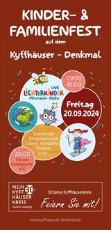 Anlässlich Ihres 30. Geburtstages laden der Landkreis Kyffhäuser und die Kyffhäusersparkasse alle Kinder am Freitag den 20.09.2024 von 09:30 Uhr bis 18:00 Uhr zu einen Familien- und Kinderfest auf das den Kyffhäuser-Denkmal ein.