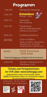 Zwischen dem Kaiser-Wilhelm Denkmal und dem Barbarossaturm feiern wir mit euch ein großes Kinder- und Familienfest. Als Highlight begrüßen wir um 12:00 die Lichterkinder Mitmach-Disko live auf der Bühne. Gemeinsam könnt ihr mit Ihnen zu den Lichterkinder Liedern singen und tanzen. Danach erwartet euch 14:30 eine großartige Stuntshow für Groß- und Klein sowie 15:30 ein tolles Theaterstück. Für viel Spaß und Spiel sorgt zudem Clown Haraldino. Freut euch auf das Kinderkarussell, eine Hüpfburg, Luftkicker, Kinderschminken uvm.. Unsere Burgfrau und der Ritter werden durch das Areal führen und sich mit den jüngsten Denkmalbesuchern auf die Suche nach der legendären Schatzkiste vom Kaiser Friedrich Barbarossa I. begeben. Für das leibliche Wohl ist gesorgt!
