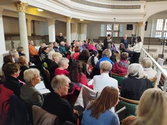 Für den musikalischen Anteil war es für Kantorin Laura Schildmann etwas leichter, da sie nach der Absprache mit Frau Greim bzgl. der einzelnen Musikbeiträge an die „Arbeit“ gehen konnte. Zuerst startete sie über die Medien ihre schon bekannte „Projekteinladung“ zu diesem Termin. So ließen sich zu den etwa 40 Kantoreimitgliedern Bad Frankenhausen/Oldisleben noch 35 weitere Sangeswillige (auf Zeit) einladen. Entsprechend der kirchenmusikalischen Tradition bzgl. der Unterkirche wurden 5 Gemeindelieder ausgewählt („Ein feste Burg ist unser Gott“ durfte natürlich nicht fehlen). Start für den so gebildeten Chor war bereits am 16. September, in den darauffolgenden 5 Proben wurden 6 Kompositionen einstudiert. Ein klassischer Gottesdienst folgt nach einem bestimmten Ablauf, danach richteten sich die einzelnen Stücke. Am Anfang stand „Morgenlicht“ mit poppigen Rhythmen, am Schluss erklang (in Erinnerung an das vor einigen Wochen in der Unterkirche aufgeführte Müntzeroratorium): „Verleih uns Frieden gnädiglich“.