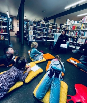 Die Atmosphäre war dank der liebevollen Vorbereitung der Bibliotheksmitarbeiterinnen gemütlich und einladend. Auf Kissen liegend und mit einem Blick auf das ein oder andere Bild im Buch, machten es sich die Kinder bequem.