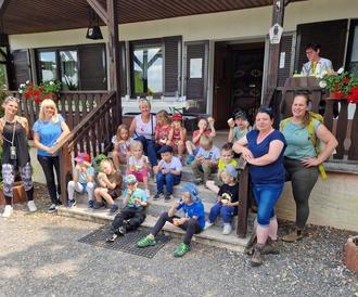 Am 13.06.2023 wurde von Muttis der Riesenzwerge aus der Kita Kyffhäuserzwerge ein toller Wandertag organisiert. Nach dem Frühstück ging es bei bestem Sommerwetter in die Ichstedter Wiesen, Wald und Flur. Frau Dildey und zwei Mamas waren schon lange vor unserem Marsch mit den Vorbereitungen tätig. Es ging zum Günthersberg und weiter in den Wald. Auf dem Weg entdeckten die Kinder zahlreiche Tiere und sie erfuhren viel Wissenswertes über deren Leben. Schnell erkannten alle, dass die Tiere Attrappen und ausgestopft waren. Mehrere Wissensspiele wurden angeboten und von unseren naturbegeisterten Kindern mit Bravur gelöst. Nach dem anstrengenden und erlebnisreichen Marsch kehrten wir beim Ichstedter Schießplatz ein. Dort erwarteten uns die Wirtsleute mit einem sehr schmackhaften Mittagessen, Getränken und als Überraschung mit einem Eisbecher. Die Kinder ließen es sich schmecken. Nach einer Ruhephase auf der Decke kehrten wir zurück in den Kindergarten. Alle waren geschafft und sehr glücklich über den gelungenen Tag.