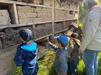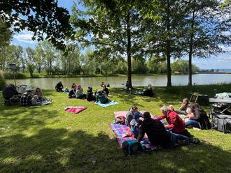 Die Erzieherinnen mit den Pfiffiküssen, deren Eltern, Omas, Opas und sogar eine Uroma, wanderten zunächst durchs Dorf Ringleben. Sie begrüßten die Störche in ihrem Nest mit einer lustigen Morgengymnastik. Weiter ging es in den Naturgarten, wo die Kinder, ausgestattet mit Lupen, im Bienenhotel nach Insekten suchten. Auf dem Radweg in Richtung Schönfeld fanden alle gemeinsam Besonderheiten der Umgebung. Mit Sackhüpfen, Eierlaufen, Tauziehen und Kreidekunst unterwegs verging die Zeit wie im Flug. Dann kam der Höhepunkt: Das Picknick am Schönfelder See. Endlich konnten die Decken ausgebreitet und die mitgebrachten Snacks verdrückt werden.