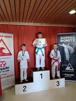 Weiter ging es im Kata-Bereich mit Till Grund in seiner Alters- und Graduierungsklasse. Er machte es Paul gleich und gewann ebenfalls bis zum Finaleinzug, alle seine Vergleichskämpfe mit 3:0 Kampfrichterstimmen. Mit einer souveränen Finalleistung setzte er sich auch gegen Arthur Sonnenkalb vom Chikara Erfurt durch, so dass er am Ende mit dem 1. Platz sich selbst belohnte. In der Kategorie alle Graduierungen in der Altersklasse bis 10 Jahre belegten beide dann noch einen hervorragenden 3.Platz hinter Richard Lippert (USV Jena) und Konstantin Gusjew (USV Erfurt).