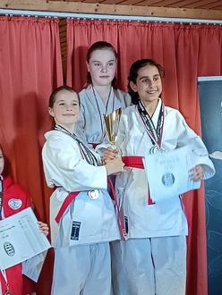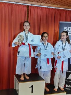 Emilia Lara Lindner und Emily Gogberashvili konnten im Kata-Einzel dann ihren Erfolg aus dem Team fortsetzen. Sie gewannen beide in der Altersklasse Schüler B weiblich ihre Vorkämpfe ebenfalls klar mit 3:0.Erst im Halbfinale trennten sich ihre Wege, Emily verlor knapp mit 1:2 gegen Izabela Ignatova (Meuselwitz), aber ihre Freundin Emilie Lara bezwang im Finale dann die Meuselwitzerin und holte sich den 1.Platz mit 2:1 Kampfrichterstimmen.
