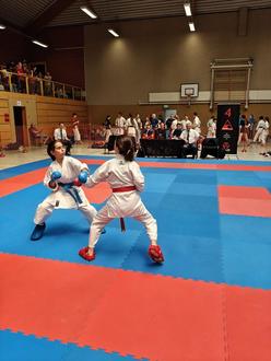 Wie bereits bei den Kindern ging es hier ohne Pause direkt zum Jiyu-Kumite (Freikampf) über. Marie und Emily durften nochmal ran und in ihrer Alters- und Gewichtsklasse kämpfen. Die hohen Temperaturen in der Sporthalle bei über 250 Zuschauern und auch zu fortgeschrittener Zeit ließ die Konzentration bei beiden sinken.