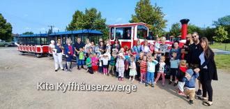 Dies war das Motto für unseren 1 stündigen Ausflug mit oben genannter Bahn. Wir, die Kyffhäuserzwerge aus Ichstedt und die Pfiffiküsse aus Ringleben kamen in den Genuß mit der Bahn durch unsere nahe gelegenen Ortschaften zu fahren. Die Kinder der Kitas und einige Angehörige hatten dabei viel Spaß und Freude so auf den Straßen ihrer Heimat zu tuckern. Bei einem Zwischenstopp auf dem Spielplatz in Udersleben konnte sich die Kinder voll austoben.