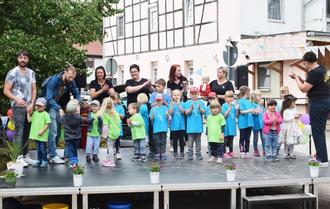 Die meisten Besucher kamen am Freitag, um auch, auf dem gegenüberliegenden alten Schulhof, das bunte Jubiläumsfest zu erleben. Natürlich waren die Familien gespannt, was ihre Kinder mit den Erzieherinnen auf der Bühne zeigen werden. Es war prima. Sie wurden mit Applaus belohnt und womöglich mit Zuckerwatte, Slush Ice oder vielen Runden auf dem historischen Karussell. Die Verkehrswacht, die Polizei und unsere Feuerwehr gaben ihr Wissen weiter. Die Vereine des Ortes gratulierten, der Spielmannszug spielte auf. Und Niemand musste hungrig nachhause gehen.