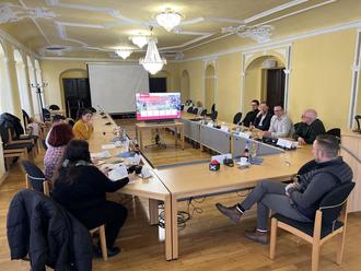 Die Teilnehmerinnen und Teilnehmer der Pressekonferenz überzeugen sich vom neuen Internetauftritt der Stadt