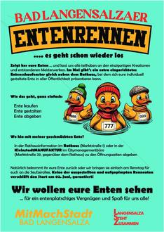 Bald hat das Warten ein Ende und der Spaß für jung, Junggebliebene und Erfahrene beginnt erneut. Das diesjährigen Entenrennen in Bad Langensalza findet am Sonntag, den 2. Juni 2024 statt. Hierfür sind alle limitierten 666 Enten, die an den Start gehen werden, mit ihrer eigenen Startnummer versehen. Zum Erwerb des noch individuell zu verzierenden Tierchens findet eine Verteilung in den Geschäften nach Ostern sowie zum Grünen Innenstadtfest statt. Wie gewohnt startet das Rennen an der Seufzerallee um 11.00 Uhr unter den Klängen des städtischen Spielmannszuges, nachdem zuvor EX7seven mit stimmungsvoller Musik alle Rennbegeisterten und Gäste herzlich willkommen heißt. Wer noch nicht gefrühstückt hat oder gern ein zweites Frühstück einnehmen möchte, ist beim Zwiwel e.V. vor Ort am Flussufer der Salza mit einem Stand des Meraki-Cafes genau richtig. Die Feuerwehr der Stadt Bad Langensalza wird den Start der Enten überwachen, es gelten gleiche Bedingungen für alle, keine Ente startet verfrüht. Der Fischereiverein unserer schönen Stadt sichert den gesamten Verlauf der Rennstreck in gewohnt professioneller Weise ab und holt am Ziel die Rennenten wieder aus dem Wasser.