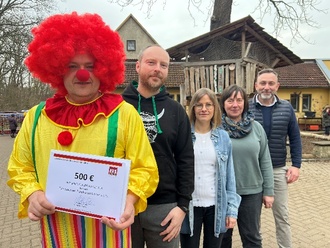 (v.l.n.r.: Erzieher Martin Richwien im Clownskostüm, Elternsprecher Maik Stelzer, Schulleiterin Liesa Kötz, Sekretärin Sabine Kruspe und Bürgermeister Matthias Reinz)