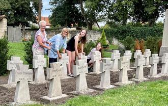 Beate Helbing und Inge Krapf machten sich an die Arbeit, schrubbten die Steine sauber, lockerten die Erde und entfernten das Unkraut. Leider waren die Namen der Gefallenen nur noch teilweise erkennbar. Elisabeth Rost forschte bei der Kriegsgräberfürsorge nach und erhielt Namenslisten. Das Friedhofsamt Bad Langensalza sponserte Säure für eine Tiefenreinigung und Permanentmarker zur neuen Beschriftung. Swea und Sari Koch malten gemeinsam mit Elisabeth Rost die Daten auf den Steinen nach.