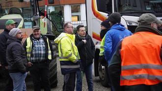 Bürgermeister Joshua Pawlak im Gespräch mit Landwirt*innen und Speditionsunternehmen/-fahrern aus Rehlingen-Siersburg bei der Versammlung vorm Rathaus am 08.01.2024