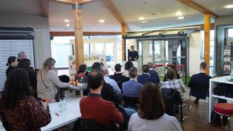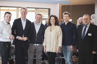 Bürgermeister Joshua Pawlak (von Links), IHK-Geschäftsführer Carsten Meier, Co-Working-Experte Tobias Decker, die Vorsitzende des Gewerbeverbandes Rehlingen-Siersburg Sandra Silvanus, Umweltstaatssekretär Sebastian Thul und Saaris-Geschäftsführer Stephan Schweitzer bei der Auftaktveranstaltung „Co-Working im ländlichen Raum“ im Showroom der Silvanus GmbH in Rehlingen.