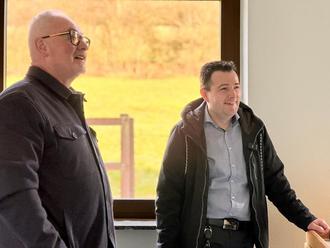 Ortsvorsteher Helmut Saretzky und Bürgermeister Joshua Pawlak bei der Ortstour in Eimersdorf im neu sanierten Dorfgemeinschaftshaus