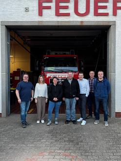 stellvertretender Wehrführer und bisheriger stellvertretender Löschbezirksführer Martin Jacobs, Fachbereichsleiterin öffentliche Sicherheit und Ordnung Christiane Schneider, Löschbezirksführerin Sabine Kerber, neu gewählter stellvertretender Löschbezirksführer Christoph Emmerich, Bürgermeister Joshua Pawlak, stellvertretende Wehrführer Peter Mellinger und Wehrführer Daniel Schwartz