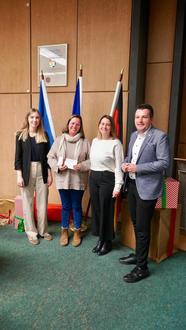 Bürgermeister Joshua Pawlak und Annika Gehl (1 .v. l. - Bereich Schule und Kindergarten) gratulieren im Namen der Verwaltung stellvertretend den Vertreterinnen des Fördervereins sowie der Schulleitung.