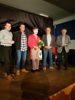 Die Veranstalter und Pantomime Jomi, erfreut und stolz nach einer sehr gelungenen Präsentation; (von links): Bürgermeister Herrn Pawlak, Herrn Jean-Luc Dauendorfer, Maire von Guerstling, Pantomime Jomi, Ortsvorsteher Reiner Petry und Martin Silvanus, Saarwald Verein