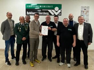 v.l.n.r.: Ortsvorsteher Sebastian Zimmer, Kreisschützenmeister Dominik Gehl, Kassierer Herbert Weirich, Minister für Inneres, Bauen und Sport Reinhold Jost, Joachim Reiter, Bürgermeister Joshua Pawlak, 1. Vors. Carsten Bachmeyer, 1. Beigeordneter Maik Licher, Beigeordneter Patrick Salzgeber