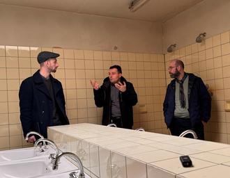 Ortsvorsteher, 1. Beigeordneter und Bürgermeister in den zu sanierenden Sanitäranlagen der Kultur- und Sporthalle Rehlingen.