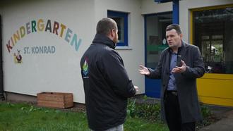 Bürgermeister Joshua Pawlak mit dem für den Kindergarten- und Grundschulbereich zuständigen Mitarbeiter Daniel Klasen im Gespräch vor der Einrichtung in Hemmersdorf.