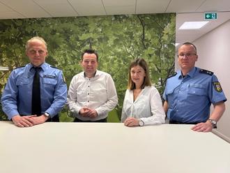 Bürgermeister Joshua Pawlak und Fachbereichsleiterin Christiane Schneider mit den Kontaktpolizisten Ralf Tschöpe (links) und Christoph Pütz.