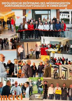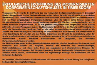 Vergangene Woche wurde die Eröffnung des neu renovierten Dorfgemeinschaftshauses in Eimersdorf gefeiert. Bürgermeister Joshua Pawlak und Ortsvorsteher Helmut Saretzky begrüßten alle ehrenamtlichen Helfer*innen, Orts-, Gemeinderats- und Fraktionsvertreter*innen, sowie Interessierte zu einem feierlichen Fest im frisch umgestalteten Dorfgemeinschaftshaus. Über die letzten Jahre hinweg wurde das Dorfgemeinschaftshaus mit einem Investitionsbetrag von über 500.000 Euro grundlegend saniert und zu einem modernen, ansprechenden Ort für die gesamte Dorfgemeinschaft umgestaltet. Dabei flossen zahlreiche Ideen und Anregungen aus der Bevölkerung und dem Ortsrat in die Planung und Umsetzung ein, wofür die Gemeinde ihren herzlichen Dank an die vielen ehrenamtlichen Helfer*innen ausspricht. Als Zeichen der Wertschätzung und Anerkennung für ihren Einsatz lud die Gemeinde alle Interessierten zu einer Besichtigung der Arbeiten und des finalen Ergebnisses ein. Obwohl die Veranstaltung unter der Woche stattfinden musste, aufgrund der bereits hohen Auslastung durch Veranstaltungen und Feiern an Wochenenden, nutzten zahlreiche Besucher*innen die Gelegenheit, das renovierte Dorfgemeinschaftshaus zu erkunden.