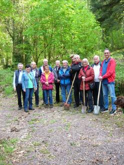 Unser Foto zeigt die Akteure vor der gepflanzten jungen Rot-Eiche; u. a. Ortsvorsteher Dr. Michael Altmayer (rechts), Michael Klein (5. von rechts), die Vorsitzende des Vereins der Gartenfreunde Gertrud Baselau (3. von rechts) und der Vorsitzende des Saarwald Vereins Martin Silvanus (links).