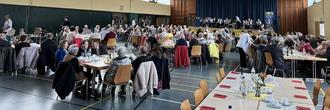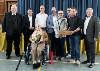 Die Geehrten Frau Maria Müller und Herr Wilhelm Müller mit Pastor Ingo Flach, Bürgermeister Joshua Pawlak, Ortsvorsteher Dr. Michel Altmayer, dem 1. Beigeordneten Maik Licher, Minister Reinhold Jost, dem stellv. Ortsvorsteher Kai Winter und dem Beigeordnete Patrik Salzgeber.