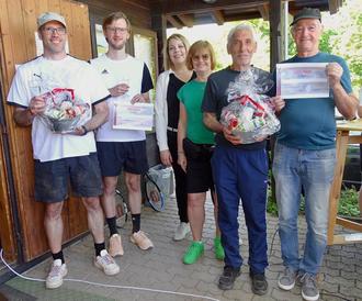 Tennis-Sieger Alexander und David, Vereinsvorstand Annika und Simone sowie Boule-Sieger Axel und Francesco
