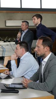 Martin Backes (Kommunalmanager/Beteiligungsmanagement der energis GmbH) und Dr. Ralf Derr (Unternehmensentwicklung der energis GmbH) gemeinsam mit Bürgermeister Joshua Pawlak und stellv. Bauamtsleiter Jan Moinot bei der KickOff Veranstaltung in Rehlingen.
