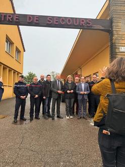 Ministerpräsidentin Anke Rehlinger, mit dem französischen Präfekten, den Bürgermeistern Armel Chabane (Bouzonville) und Joshua Pawlak sowie den Beigeordneten Maik Licher und Roland Gloden (Bouzonville) zusammen mit den Feuerwehrleuten aus Bouzonville.