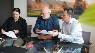Unterzeichnung der Kooperationsvereinbarung durch die Geschäftsführung der Sozialwerk SaarMosel gGmbH Nadine Budde, Prokuristin und Harald Beyer, Geschäftsführer mit Bürgermeister Joshua Pawlak.