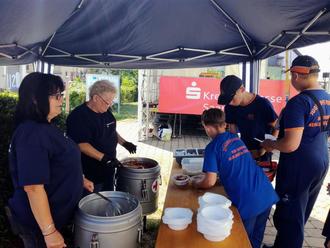 Der DRK OV Rehlingen-Siersburg hatte die Aufgabe, die Teilnehmer des Leistungsmarsches im Anschluss mit einem Essen zu verpflegen. Hierzu wurden durch uns 100 Portionen Nudeln mit Tomatensauce gekocht und an die Teilnehmer ausgegeben.