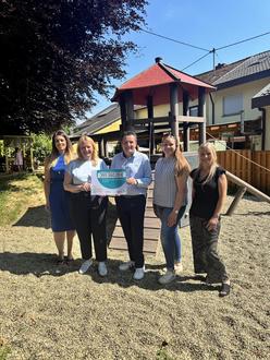 Für die Erweiterung der Kita St. Mauritius in Fremersdorf überreichte Bildungsministerin Christine Streichert-Clivot den Förderbescheid an Bürgermeister Joshua Pawlak. Unterstützt wird er durch die Gesamtleitung der Kita gGmbH Rehlingen-Siersburg Andrea Hero, die Leiterin der Einrichtung Clara Hilgert und der Gemeindearchitektin Henrike Klemens.