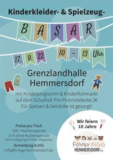 Am Samstag, 17.09.2022, findet anlässlich unseres 10-jährigen Jubiläums ein Kinderkleider- und Spielzeugbasar in der Grenzlandhalle Hemmersdorf statt. Verkauft werden vor allem Herbst- und Winterkleidung und alles rund ums Kind.