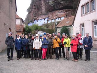 Unser Foto zeigt die Wandergruppe in Graufthal, im Hintergrund die sog. Felsenhäuschen des Ortes.