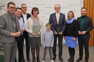 Bei der Preisverleihung: Innenminister Rheinhold Jost (v.l.), Bürgermeister Joshua Pawlak, der Siersburger Ortsvorsteher Dr. Michael Altmayer mit den Geehrten Sabine Weber und Kajo Hilt sowie jungem Gratulanten in der Mitte und den Landtagsabgeordneten Sandra Quinten und David Maaß.