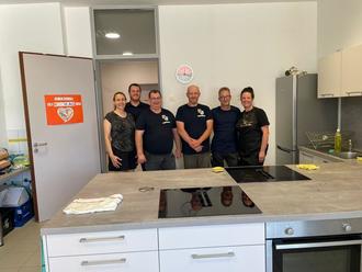 Vertreter*innen der Jugendabteilung des Fischereiverbands Saar beim Kochkurs in der Grundschule Rehlingen mit dem für Kindergärten und Schule zuständigen Mitarbeiter der Gemeindeverwaltung Daniel Klasen.
