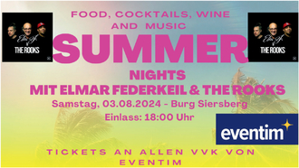 Die SG Kultur in Kooperation mit der Gemeinde Rehlingen-Siersburg lädt am 03. August 2024 zu einem unvergesslichen Abend auf der Burg Siersberg ein. Im Rahmen der Summer Nights wird die Band Elmar Federkeil & The Rooks ab 19:30 Uhr für musikalische Highlights sorgen. Einlass ist ab 18:30 Uhr. Karten sind an allen Vorverkaufsstellen von Eventim erhältlich.