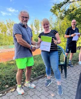 Unser erster Vorsitzender Thomas Kiefer beglückwünscht Lisa Querbach zum Sieg im Tennisturnier. Hinten Francois Styga, der Zweitplatzierte